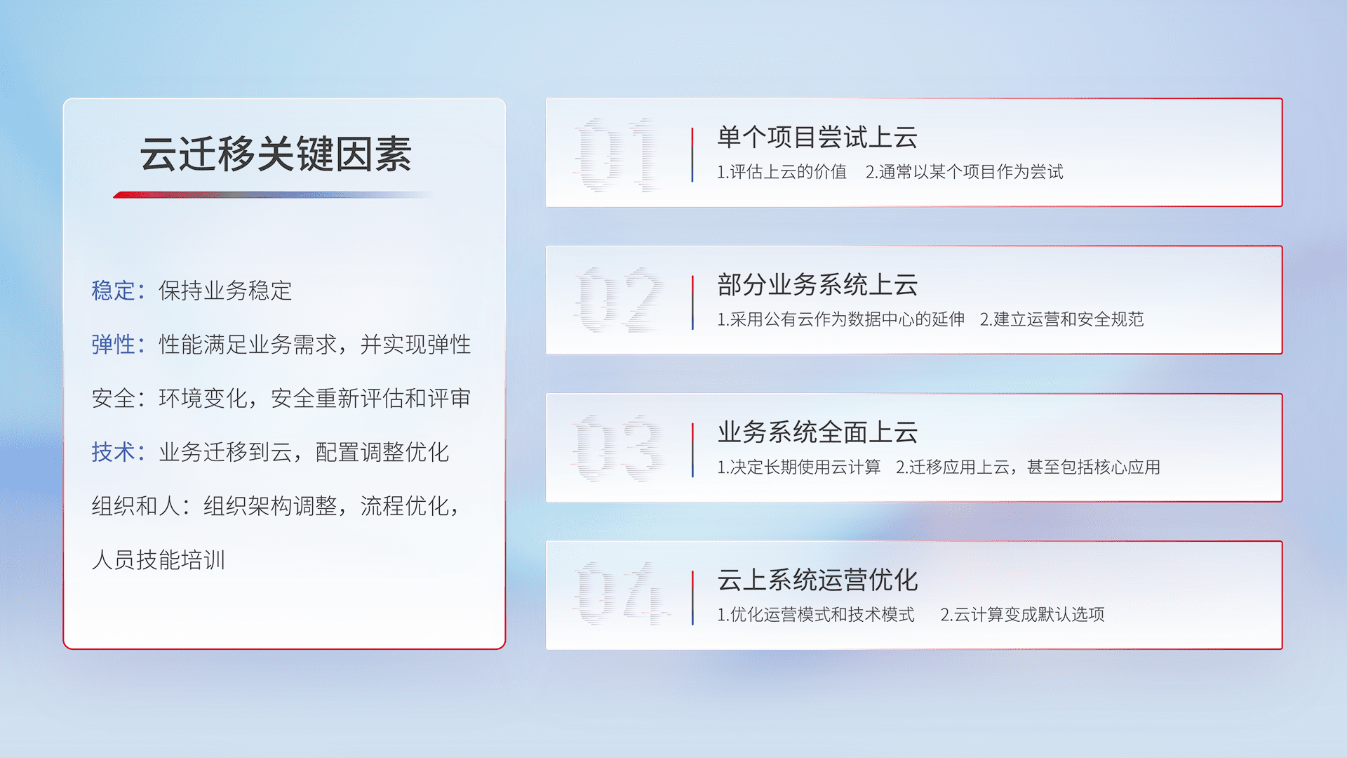 结合实际业务,,,,从规划设计、、云平台选型、、、云原生改造、、、数据迁移、、、集成交付,,,迁移全过程为客户识别最佳上云路径,,,,做好风险识别管理,,设计网络架构、、、身份权限、、安全审计合规、、、操作审计、、日志审计、、、监控告警策略、、、多站点容灾设计等,,,对云上基础设施进行整体规划,,提升IT治理水平,,,,以满足弹性、、、高可用、、、高性能的需求。。