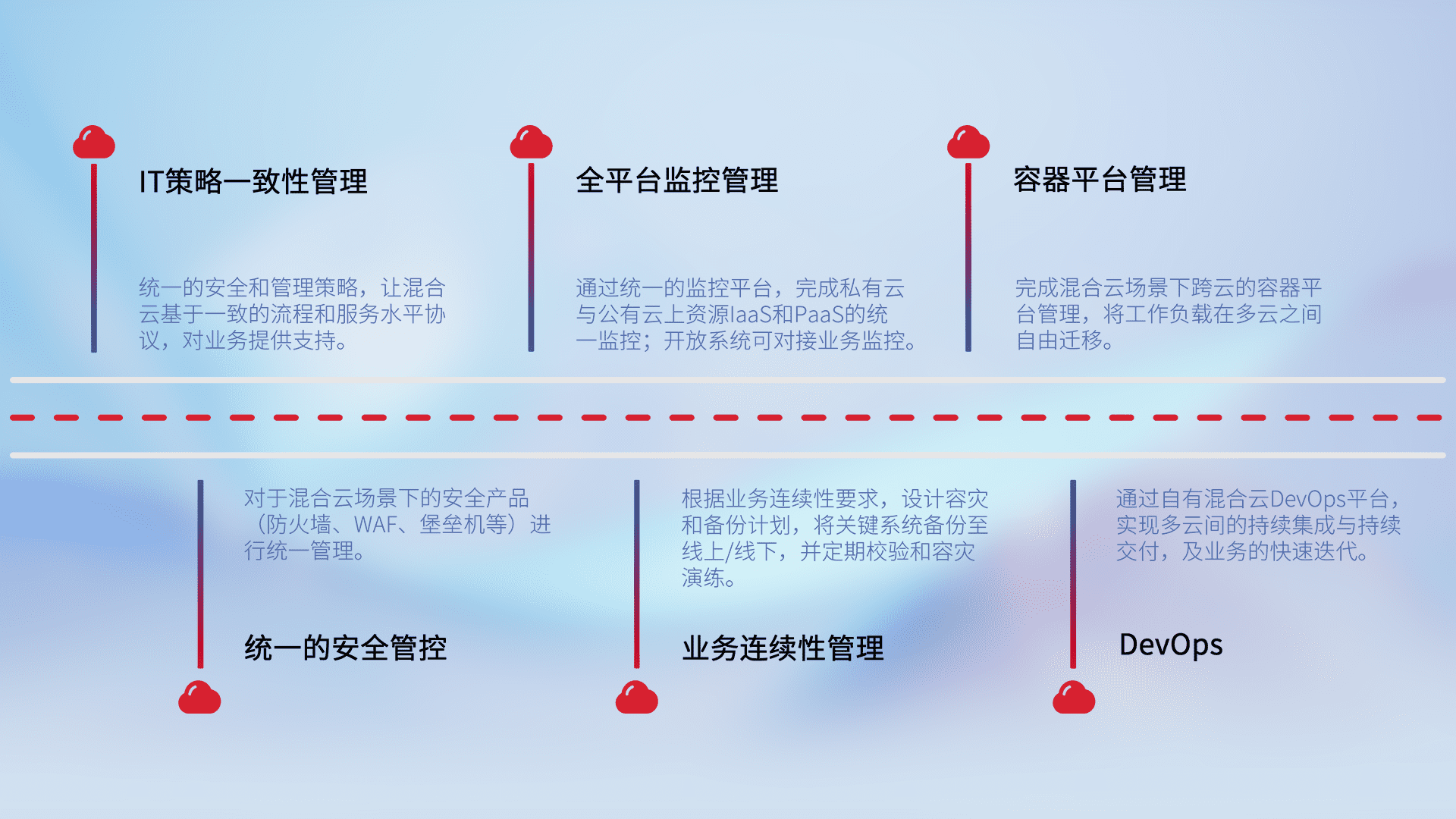 通过多云纳管,,,以统一的资源数据模型把客户的云资源进行抽象和封装,,,进而实现对多云资源的统一操作,,,保障云资源管理的可靠性、、稳定性与可用性。。。。量身定制化运维内容,,,配置、、开发运维、、、、补丁管理、、、、备份、、监控、、认证和访问管理、、、审计和日常巡检等,,,保障在用云过程中的可靠度,,,稳定度以及高可用率。。
