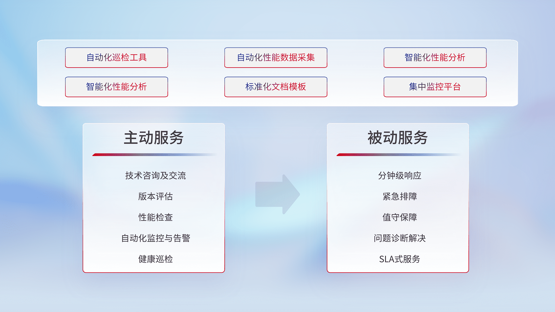智能化工具和标准化文档,,,保障服务质量,,,提供主动服务(包含技术咨询、、版本评估、、、性能检查、、、、自动化监控与告警、、健康巡检)和被动服务包含(分钟级响应、、紧急排障、、、、值守保障、、、、问题诊断解决、、SLA服务)。。。。